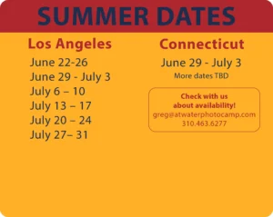 Photo Camp Photo Camp Los Angeles, CA – Westport, CT Book LA Photo Camp PHOTO CAMP: IN-PERSON Choose a WeekChoose camp weekJune 22 - 26June 29 - July 3July 6 - 10July 13 - 17July 20 - 24July 27 - 31Camera ReplacementSingle $675.00QuantityTotal Promo CodeApplySpace is limited, please list any back up dates. Camper Information Camper NameCamper NameCamper NameAgeAgeAgePreferred PronounPreferred PronounPreferred Pronoun Parent Information Parent First Name Parent Last NameEmailPhone Number It's helpful to know how you heard about us, please let us know! Yelp Instagram Returning Camper Friend Google Facebook MOMSLA OtherEnroll in Photo Camp Here Your privacy is important to us. We never share personal info with anyone for any reason.Any questions, please email us here. For the waitlist, please call us or email us HERE. Please visit our FAQ PAGE ______________________________________________ Atwater Photo Camp is a super fun and exciting 5 day photo adventure that inspires kids to explore their world in a deeper way. Through games and activities designed to challenge perspective, we build skills with camera, light and storytelling. We begin with a basic overview of camera functions. Then through practice we learn how to make images, rather than take them. Each day and every week is completely unique. We review our work daily, and on Friday we host an exhibit where campers showcase their work for friends & family. Ultimately campers develop their photographic eye and learn new ways of seeing. Pick up and drop off is at our studio in El Sereno and at nearby locations (i.e. DTLA, Griffith Park) Daily Activities: – Visual inspiration & discussion– Instruction of styles, tools and techniques– Assignments for the day’s expedition– Photo expedition – morning– Lunch– Photo expedition – afternoon– Photo review & discussion– Final thoughts– Fun Work 5 day Photo Camp with Greg Cohen & Alyson AlianoPhoto Camp counselors are working photographers who have been in the industry for years. With experience in education and childhood development, they understand how to ignite passion and curiosity in a non-competitive environment. – – – – – – – – – Details Time: 9am – 3pmAges: 8 – 16: We do not accept campers under 8 years of ageEnrollment Limit: 13 campersSkill/Experience Level: Beginning/intermediateWhat to Bring: camera, flash card, lunch* (we have cameras available for those who don’t, pending availability. Please visit our FAQ page)For waiting list, please email HERETuition: $675 *Lunch: Please bring a bagged lunch or cash for lunch on location. ________________________ Book LA Photo Camp PHOTO CAMP: IN-PERSON Choose a WeekChoose camp weekJune 22 - 26June 29 - July 3July 6 - 10July 13 - 17July 20 - 24July 27 - 31Camera ReplacementSingle $675.00QuantityTotal Promo CodeApplySpace is limited, please list any back up dates. Camper Information Camper NameCamper NameCamper NameAgeAgeAgePreferred PronounPreferred PronounPreferred Pronoun Parent Information Parent First Name Parent Last NameEmailPhone Number It's helpful to know how you heard about us, please let us know! Yelp Instagram Returning Camper Friend Google Facebook MOMSLA OtherEnroll in Photo Camp Here Your privacy is important to us. We never share personal info with anyone for any reason.Any questions, please email us here. ________________________ *A minimum of 8 campers is necessary for camp to run on any given week. If we are not able to secure attendance, we will notify you at least one to two weeks in advance. Your deposit will apply to another session or we’ll refund you in full. Phone: 310-463-6277WEST COAST ADDRESS: 4874 Huntington Drive LA, CA 90032EAST COAST ADDRESS: 75 Church Lane, Westport, CT 06880 Feel free to reach out if you have any questions at all.camp@atwaterphotocamp.com310-463-6277 ________________________ For all questions, please visit our FAQ PAGE ________________________ Thanks For Sharing! Set Youtube Channel ID